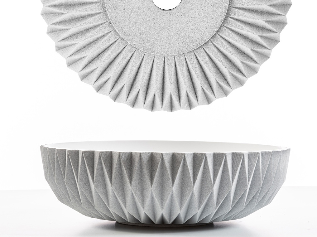 Lavandino stampato 3D con polveri di quarzo bavarese e design esclusivo. Disponibile bianco e grigio.