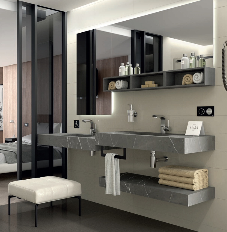 i progetti di TOP su misura COMPAKT e la proposta Neo-Industrial VINCI, che lega e fonde i materiali per allestire bagni unici nel suo genere.