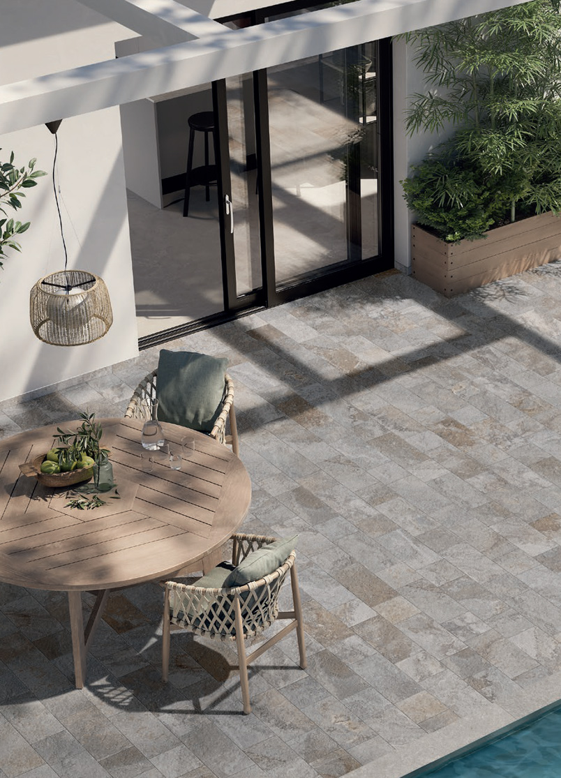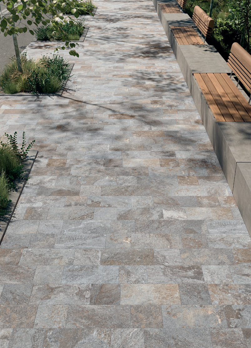 Externa Quarzite di Emilceramica é forte e resistente, come la pietra dolomitica d'ispirazione, la collezione é studiata per esterni di ambienti pubblici e privati che richiedono le piú elevate prestazioni tecniche di resistenza agli agenti atmosferici e alle sollecitazioni. La raffinata eleganza della superficie grafica, ricca di suggestioni cromatiche, sapientemente si accorda a paesaggi architettonici sia di stile classico che contemporaneo. L'effetto pietra conferisce a tutto l'ambiente esterno una naturalezza non indifferente che si sposa alla perfezione con l'ambiente circostante: é l'accostamento perfetto con il verde della natura o l'azzurro del cielo. Lo stile di Externa Quarzite regala allo spazio un design contemporaneo ma senza tempo, adatta la semplicitá di un materiale come la pietra all'innovazione stilistica. L'abbinamento perfetto con una pavimentazione di questo tipo puó essere il un colore come il marrone, il beige o il crema per l'arredo, oppure ancora colori che richiamano l'ambiente, come il verde, l'azzurro e il blu.